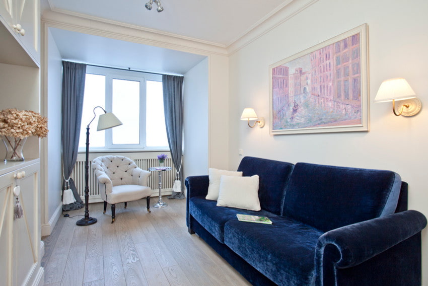 The sofa model of this color can harmoniously fit into many interior trends, for example, such as loft, minimalism, Provence, classic, neoclassic, Scandinavian, modern, oriental or nautical style. A laconic sofa in a dark blue or sky blue shade will perfectly match the snowy color palette and natural finishes of the Scandinavian interior, which will acquire an even more natural and light look.
