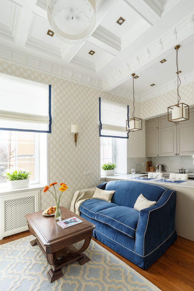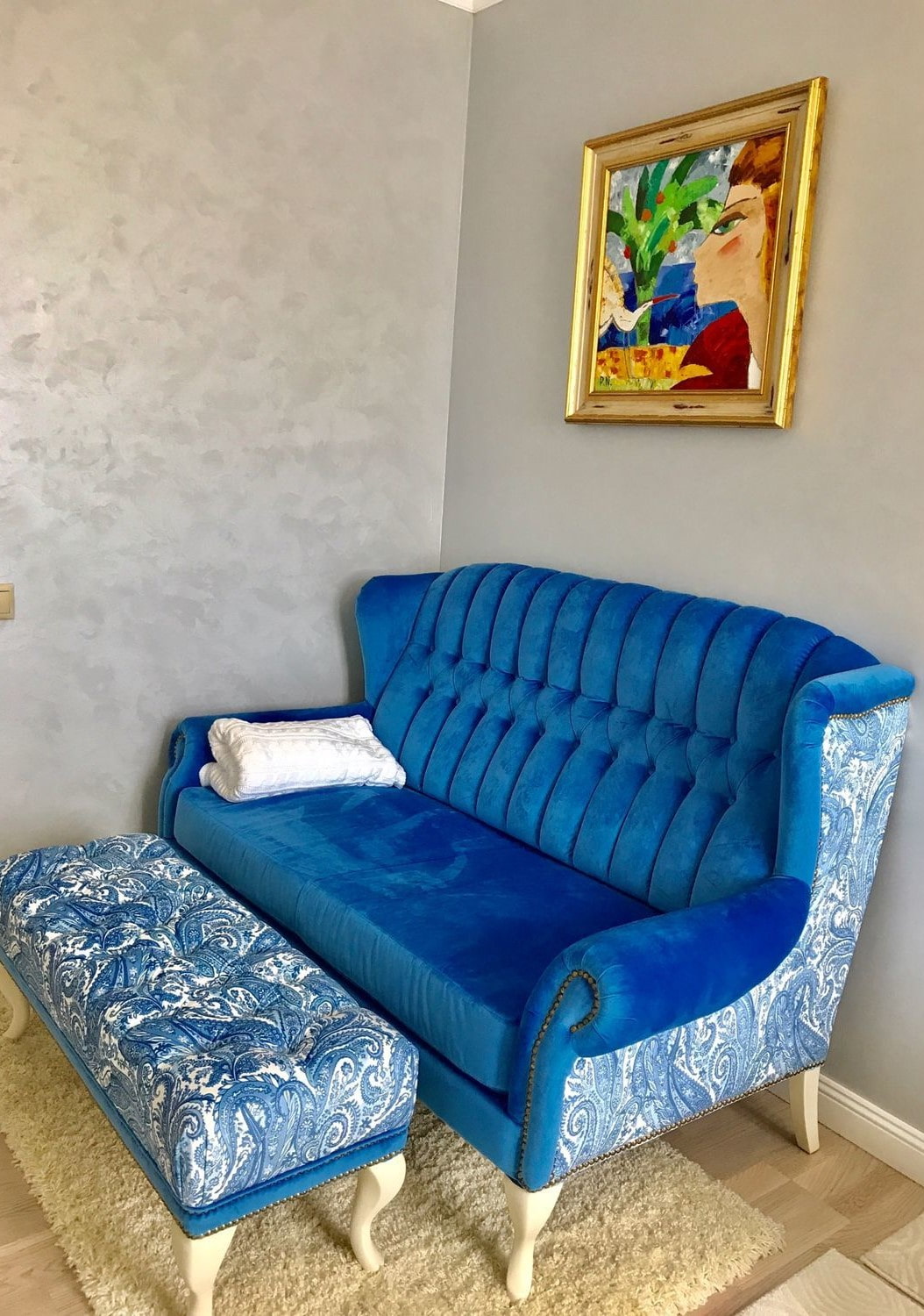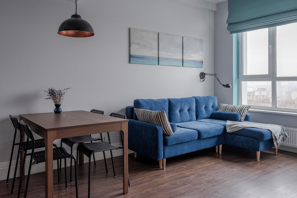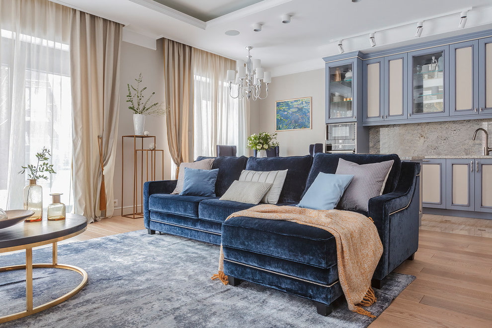 The photo shows the interior of the kitchen-living room with a velor sofa, made in bright blue.