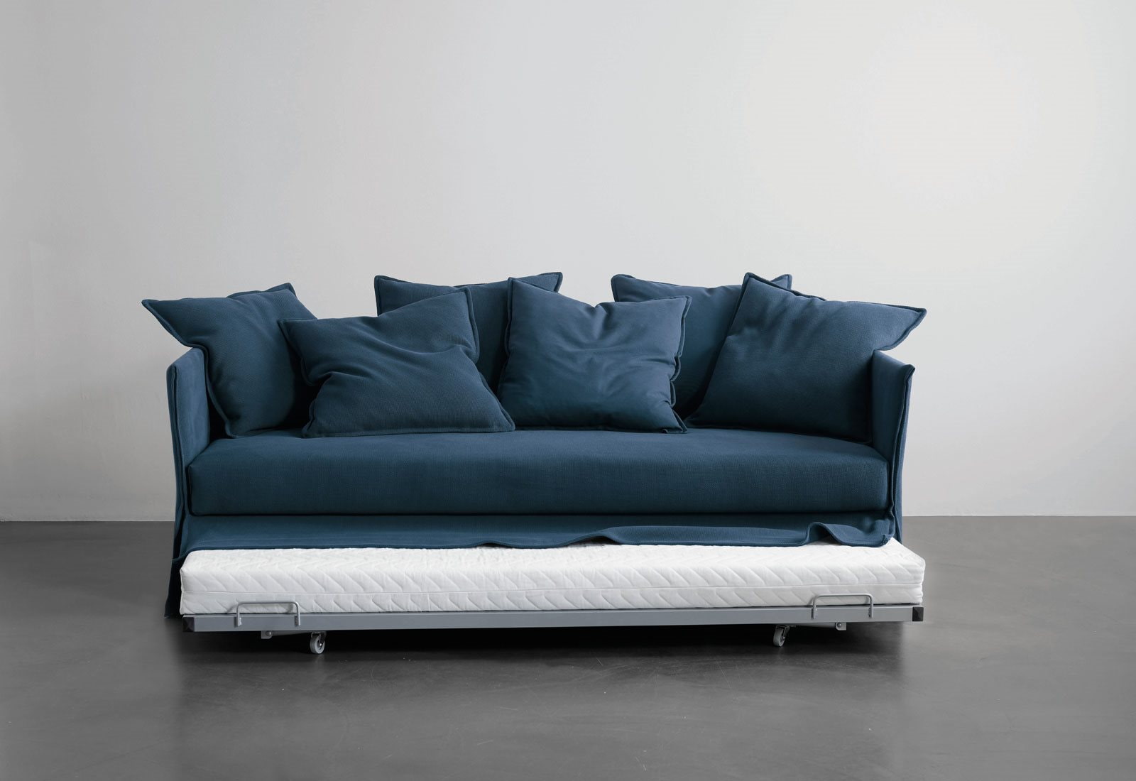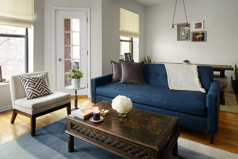 - A blue sofa, by focusing on itself the views, is able to visually enlarge a small room and vice versa, reduce the space in the overall room.