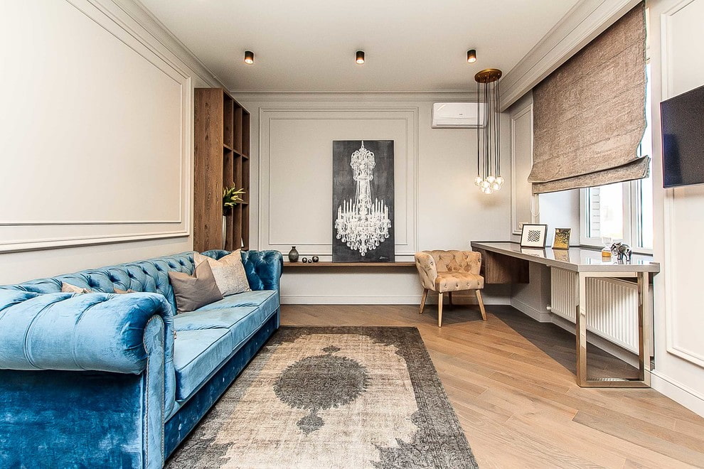 In the interior of the living room, models will look equally good, both in pastel and light blue colors, and products of a more saturated and deep shade. When choosing a dark color scheme, you should take care of high-quality lighting in the form of lamps, chandeliers or floor lamps, which can have the usual white-yellow light.