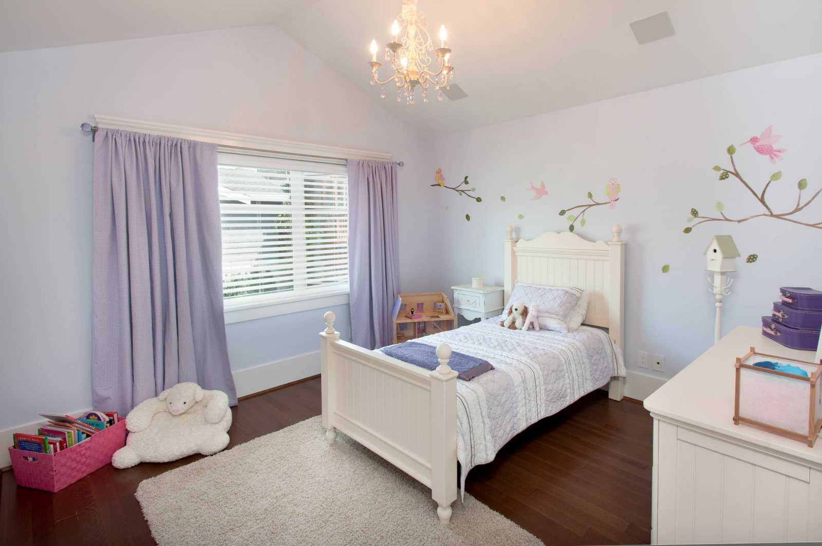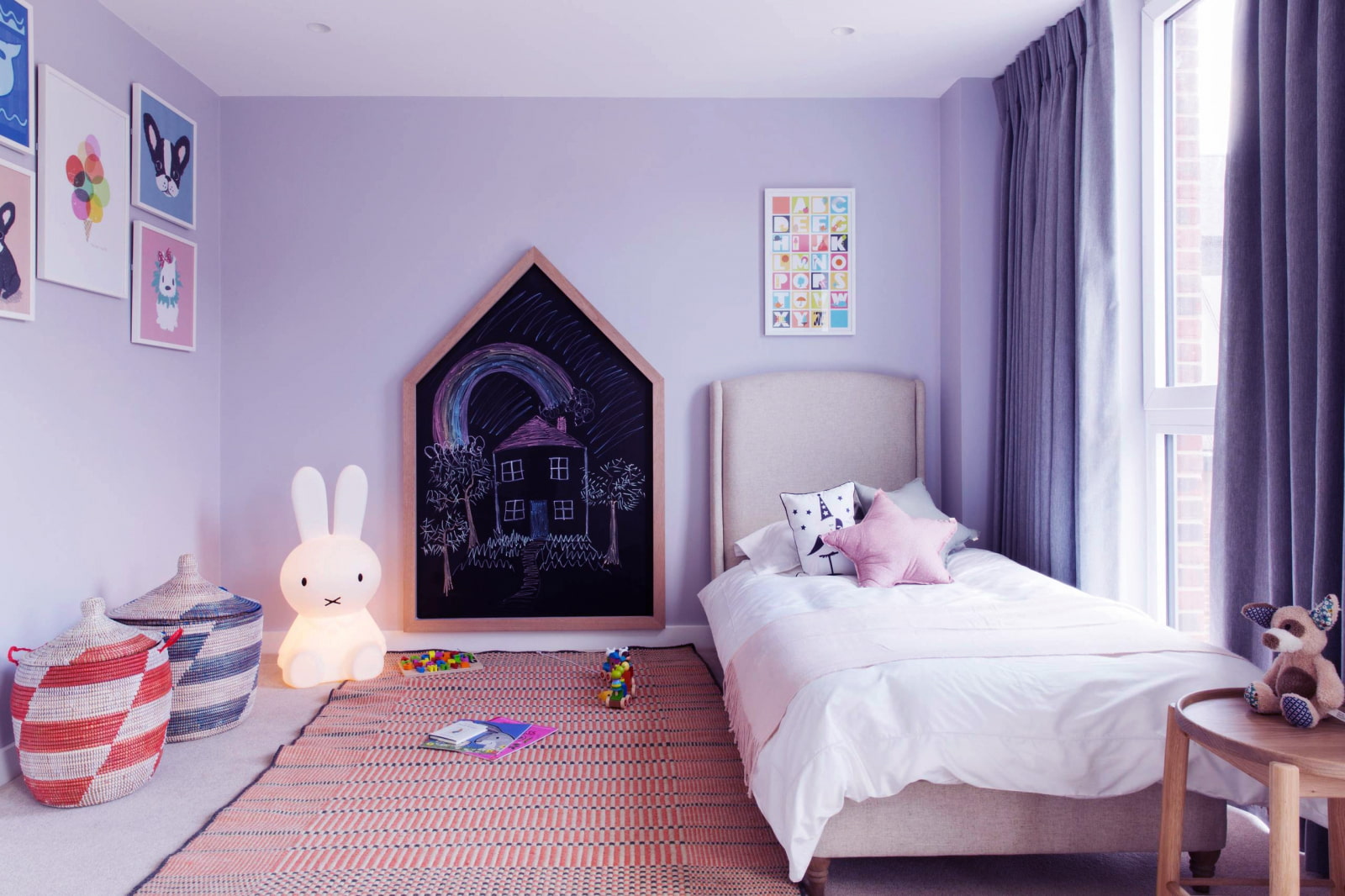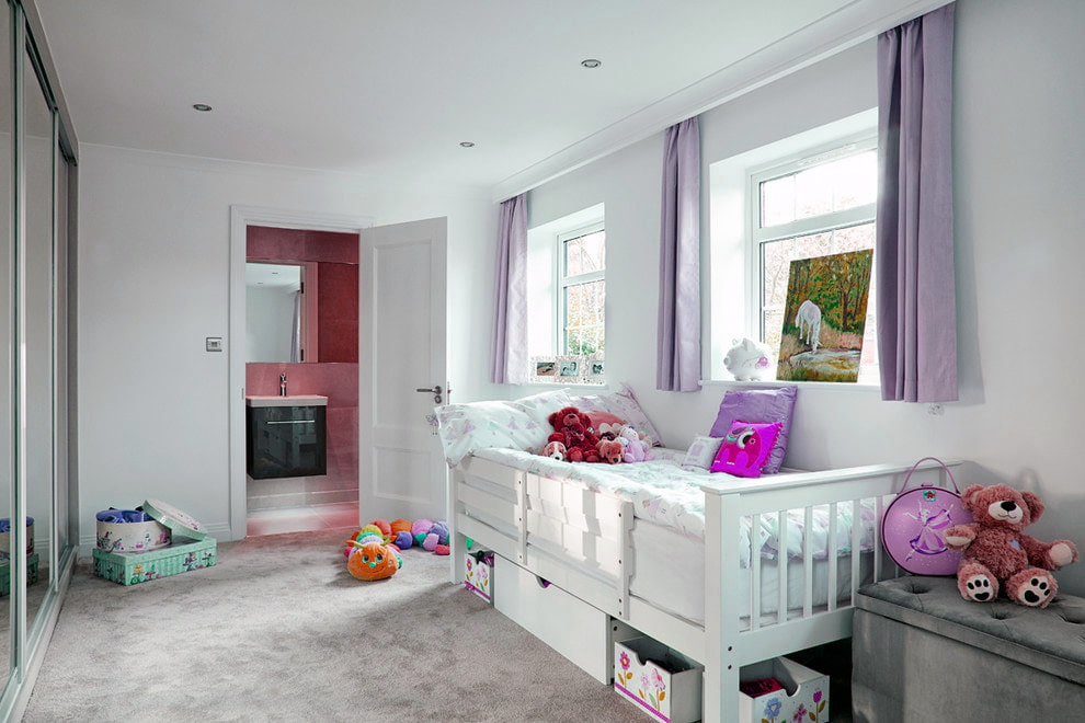 In the photo there is a children's room and light lilac curtains with a drawstring attachment.