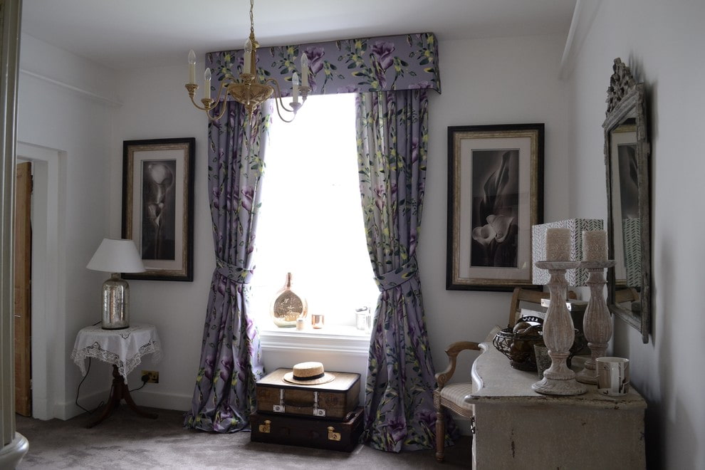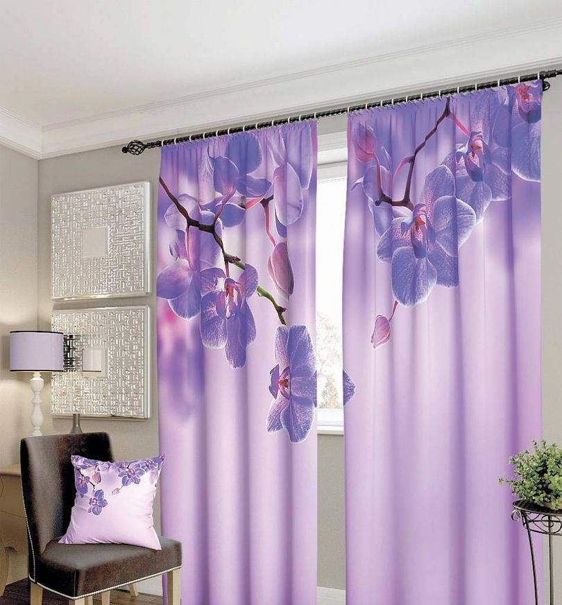 Lilac curtains with a small floral pattern will perfectly fit into a small room. Curtains decorated with large flowers will be an excellent option for large rooms and emphasize the width of the window opening.