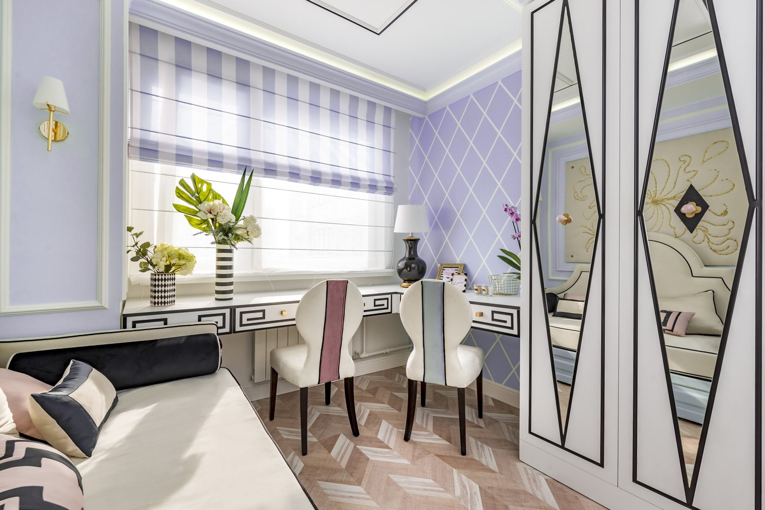 Striped curtains in light lilac shades emphasize the elegance of the entire interior. Using this print allows you to choose bold combinations and experiment with colors.