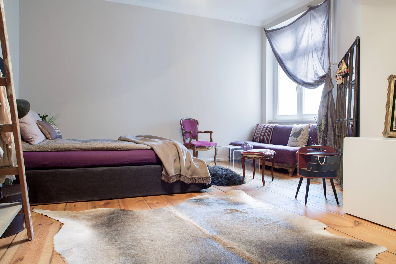 The photo shows the interior of the living room in the Provence style with dark lilac curtains.