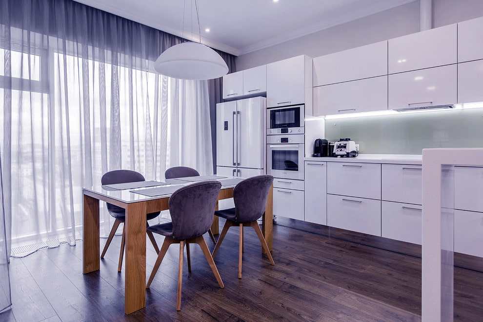 In the photo there is a kitchen in a modern style with a window decorated with lilac organza tulle.