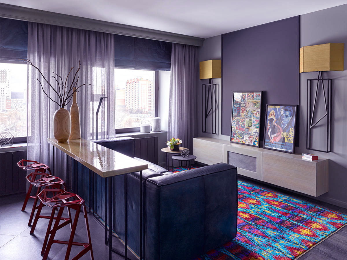 The photo shows the interior of the living room in a modern style with lilac curtains on the window.