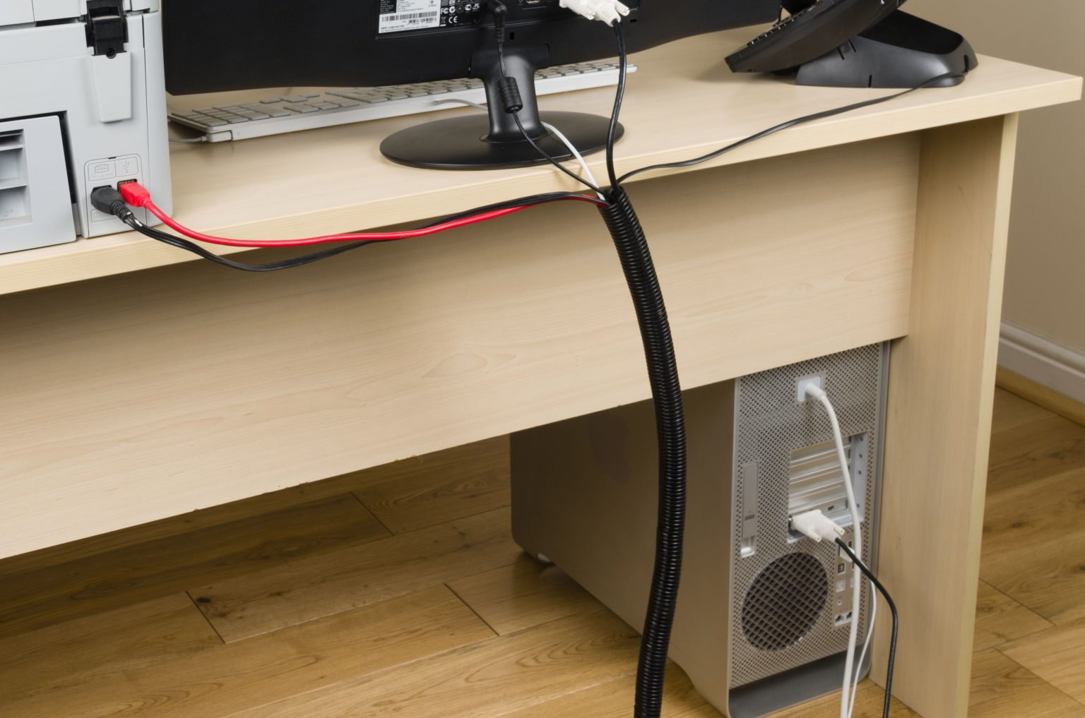 - Computer wires can be joined by corrugation or fixed under the table top using clerical binders and screws, holders or clips.