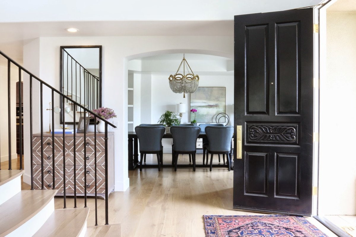 The photo shows a combination of a black door leaf with a light floor in the hallway.