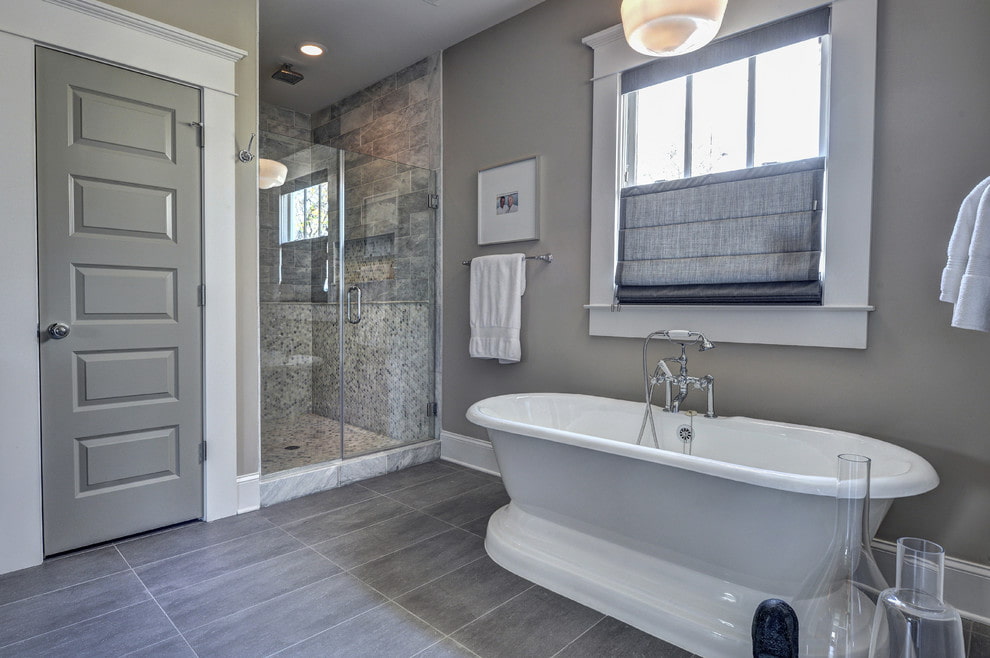In the photo there is a bathroom and a gray door in the color of the tiled floor.