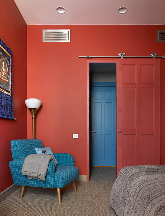 In the photo there is a complementary combination of a blue door structure and a light beige floor in the interior of the living room.