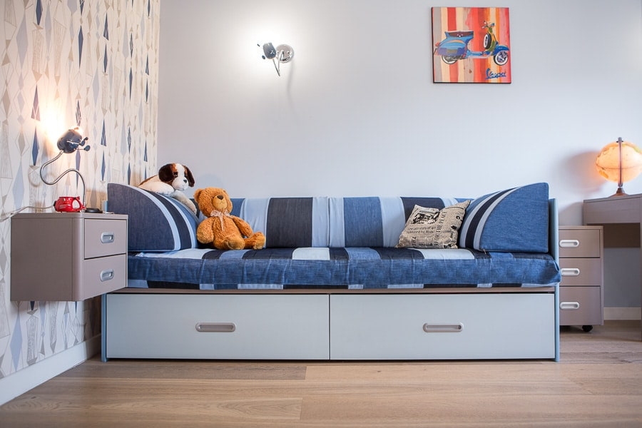 In the photo there is a white sofa equipped with storage boxes in the interior of the nursery in the Scandinavian style.