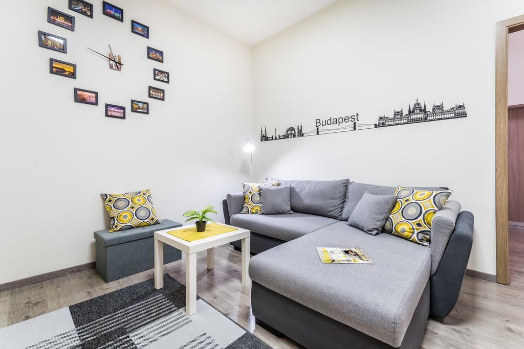 The photo shows the interior of the living room with a corner sofa in gray shades.