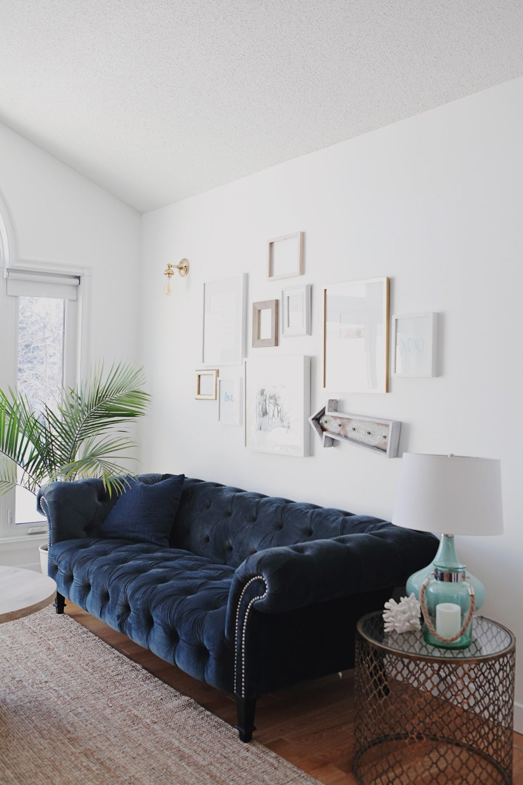 The photo shows the interior of a modern living room with a blue sofa.