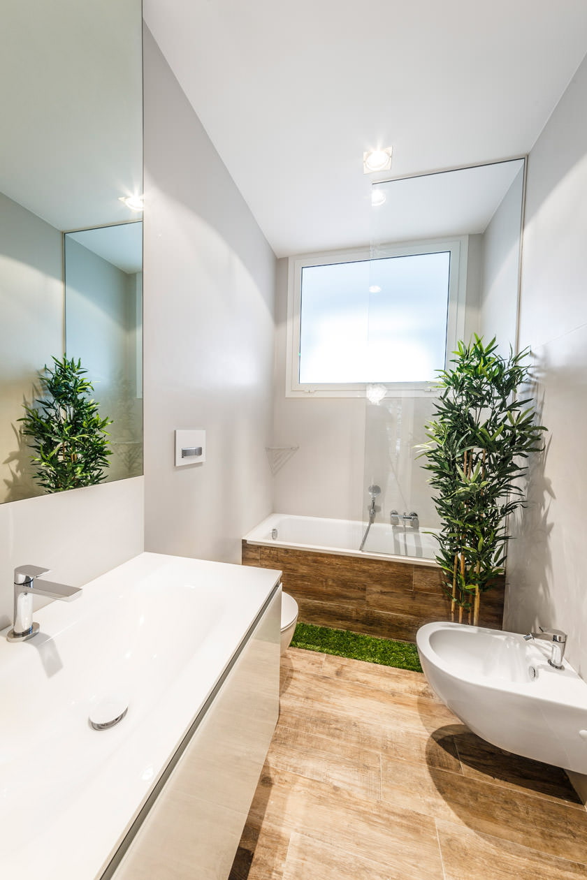 Minimalism, natural colors, space and a lot of light - this is how an eco-style bathroom design should look. Sometimes it is enough to choose just the right facing material and add a color accent with the help of bright towels - and an unforgettable look is ready.