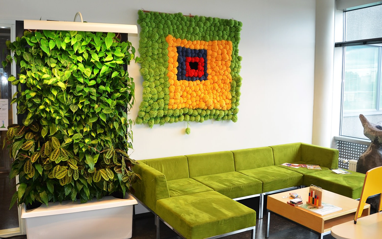 Photo 10. A simple rectangular sofa in neutral upholstery against a backdrop of green walls and wooden floors could fit any room style. An ecological focus is given to the interior by saw-cuts made of wood near the dining area and an original rack with flowers.