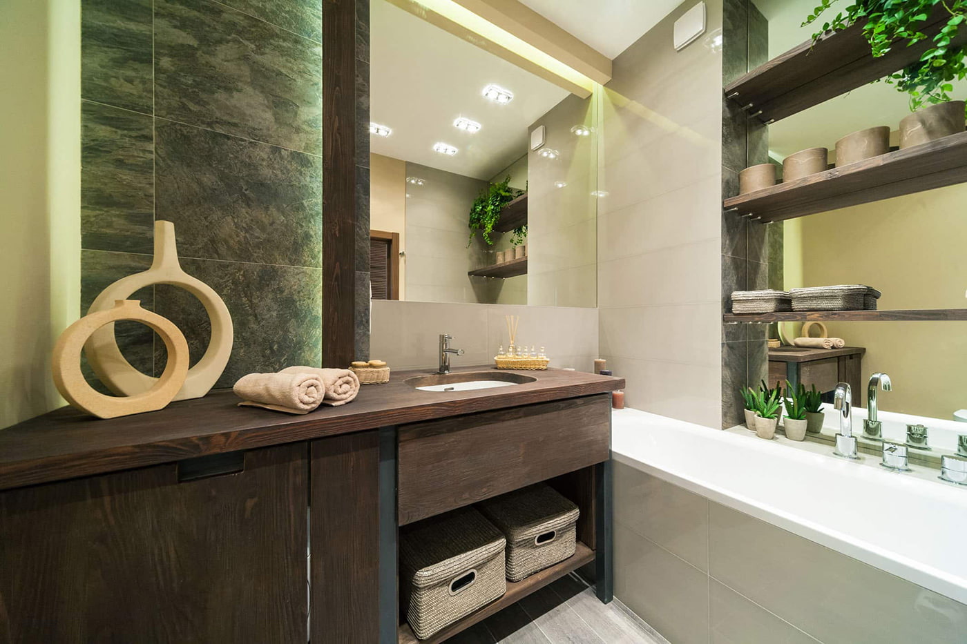 Photo 7. A small cabinet made of wood and living greenery on the wall give an ecological focus to the bathroom interior.
