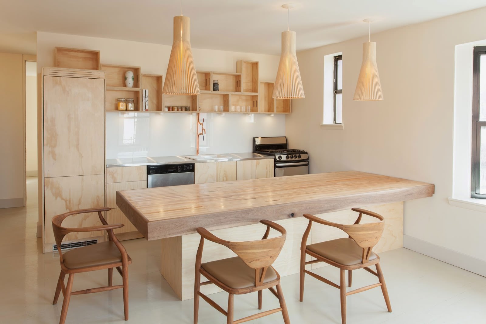 In the kitchen, like in no other room at home, it is important to observe the principles of minimalism - nothing more! Do you want to emphasize the closeness to nature and make the interior truly unusual? Choose an accent lamp, and at the same time use it as an element that separates the functional areas of the kitchen. The easiest way is to add eco-elements to the decoration, for example, by decorating plain walls with large floral ornaments or wooden cuts.
