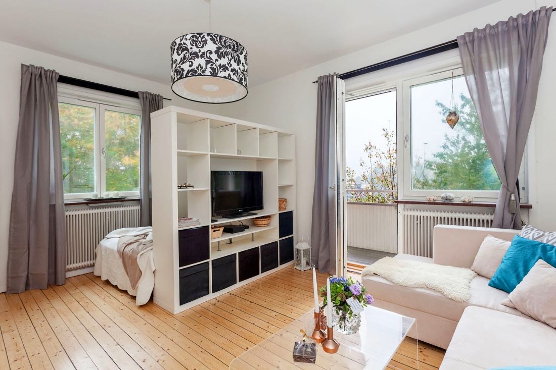 Scandinavian style with a white neutral background, solid wood furnishings, natural textiles and discreet décor will add extra space and air to the design of the room divided into the bedroom and living room. This style is characterized by zoning elements that are compact and functional.
