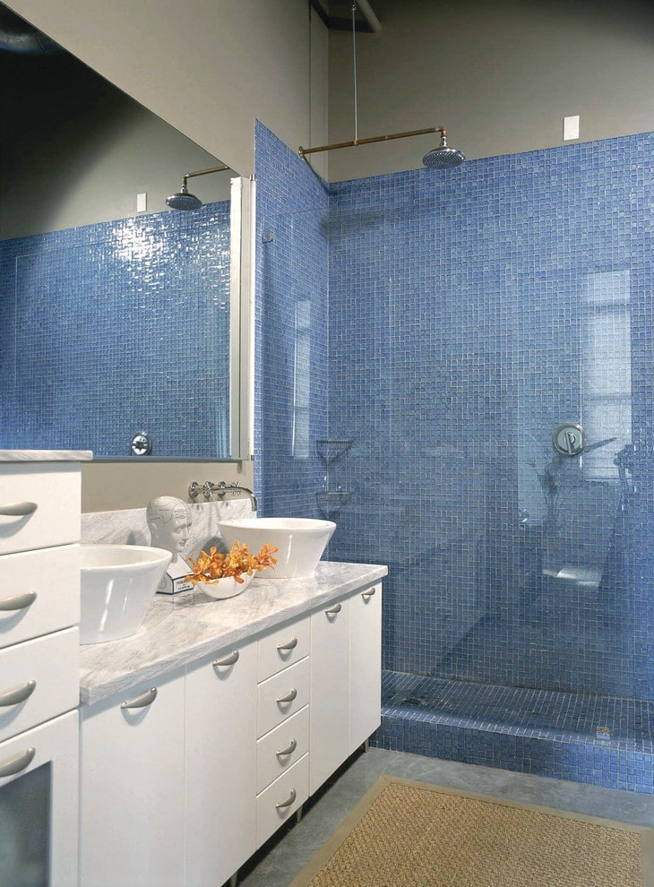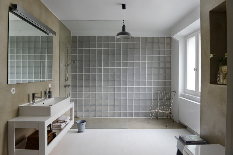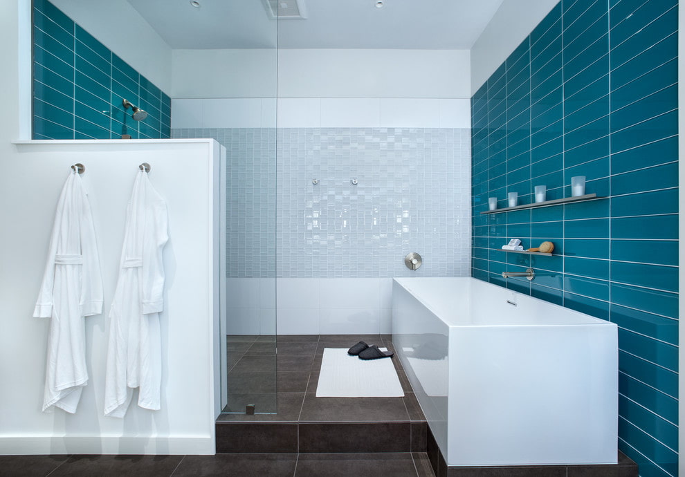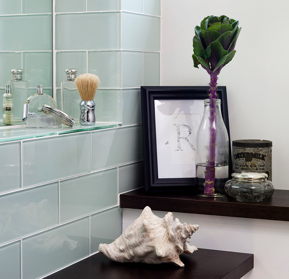 Glass tiles are often found in bathroom décor. It is not afraid of moisture and is easily cleaned of drops and streaks.