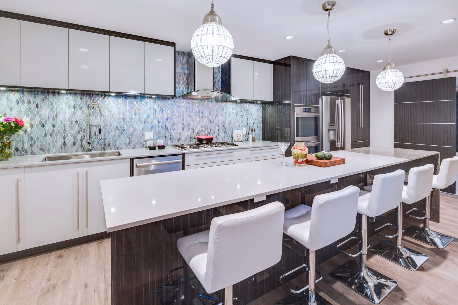 Mother-of-pearl glass tiles look great as an apron in the kitchen.