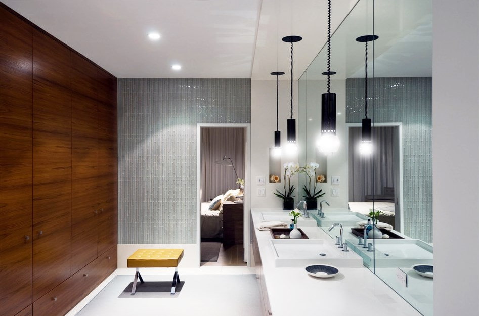 The photo shows a bathroom with transparent tiles around the doorway. It is in harmony with mirrors and helps to relieve the space in which an entire wall is reserved for bulky dark cabinets.