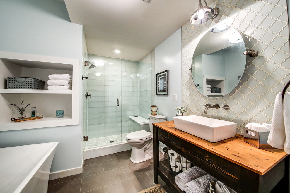 Glass products go well with tiles, paint, metal and chrome details. Small tiles are most often used in the cladding of certain areas of the bathroom: a shower cabin, an area with a mirror and a sink.