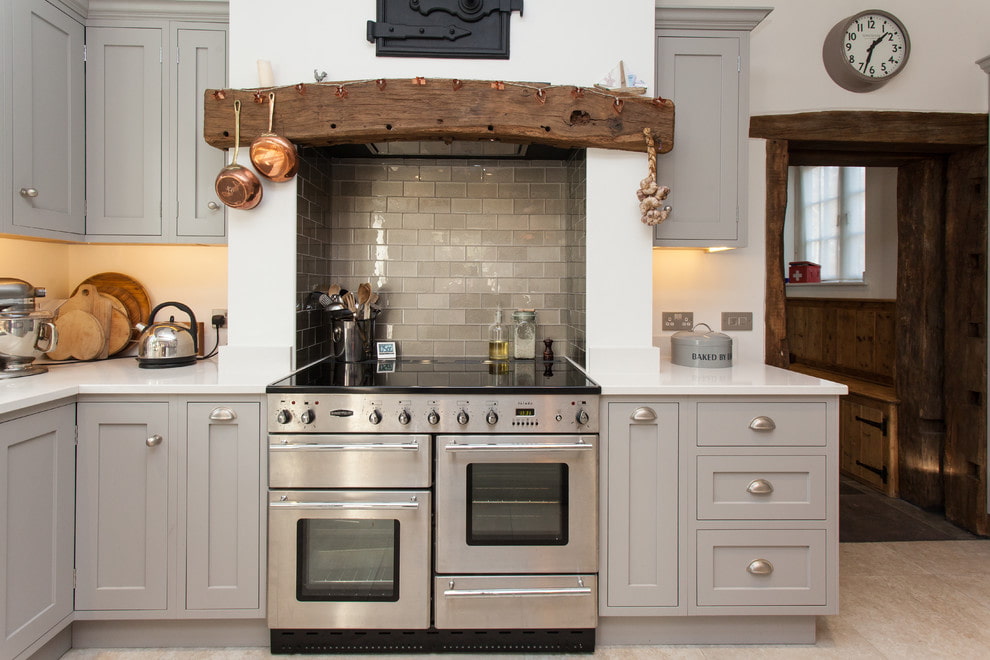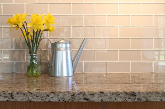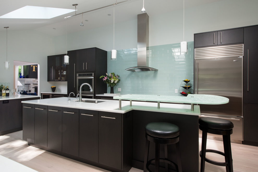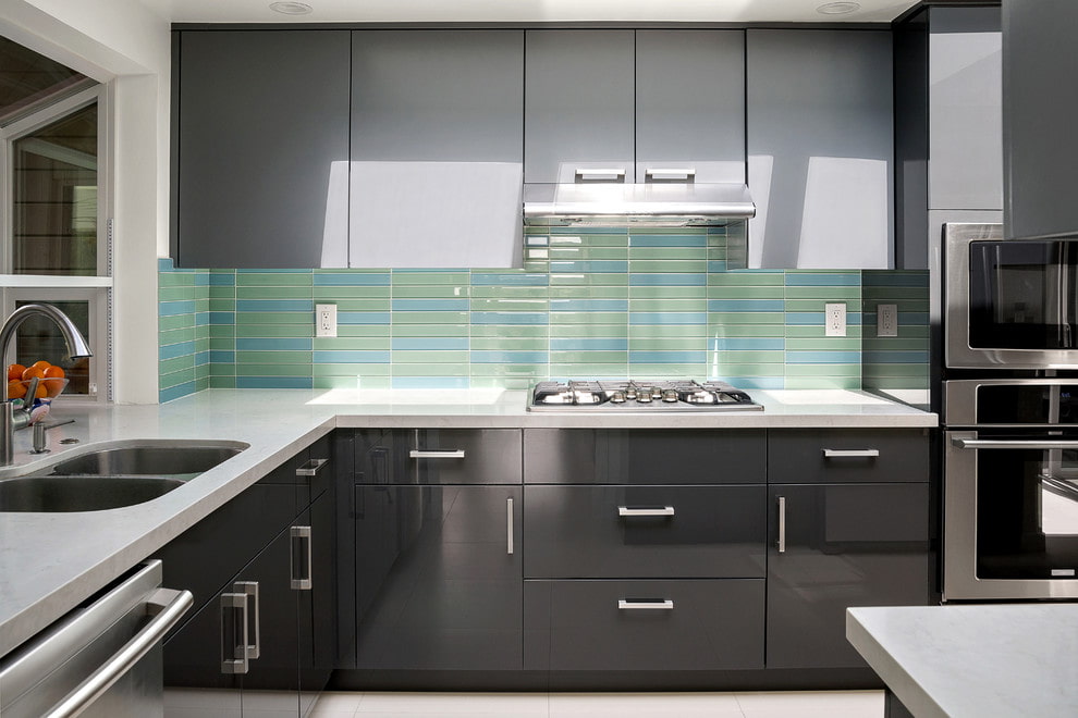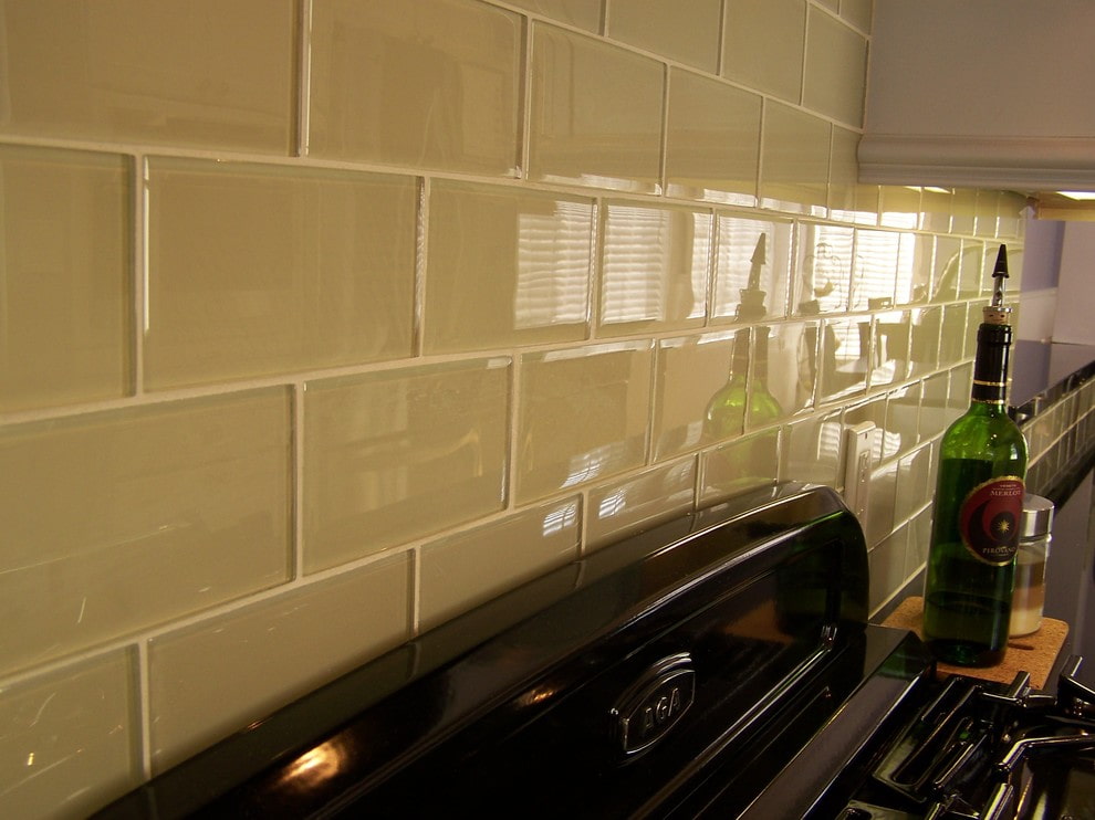 Glass tiles in the kitchen are traditionally used as an apron. It not only gives the interior a "zest", but also protects the wall in the cooking area from dirt.