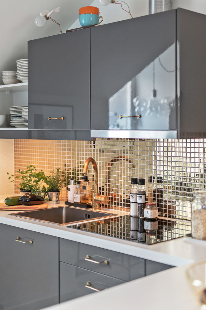 For an interior decorated in soothing colors, gray glass tiles are suitable. On the other hand, luxurious furnishings require expensive shining elements, for example, a mosaic imitating silver metal or gold.