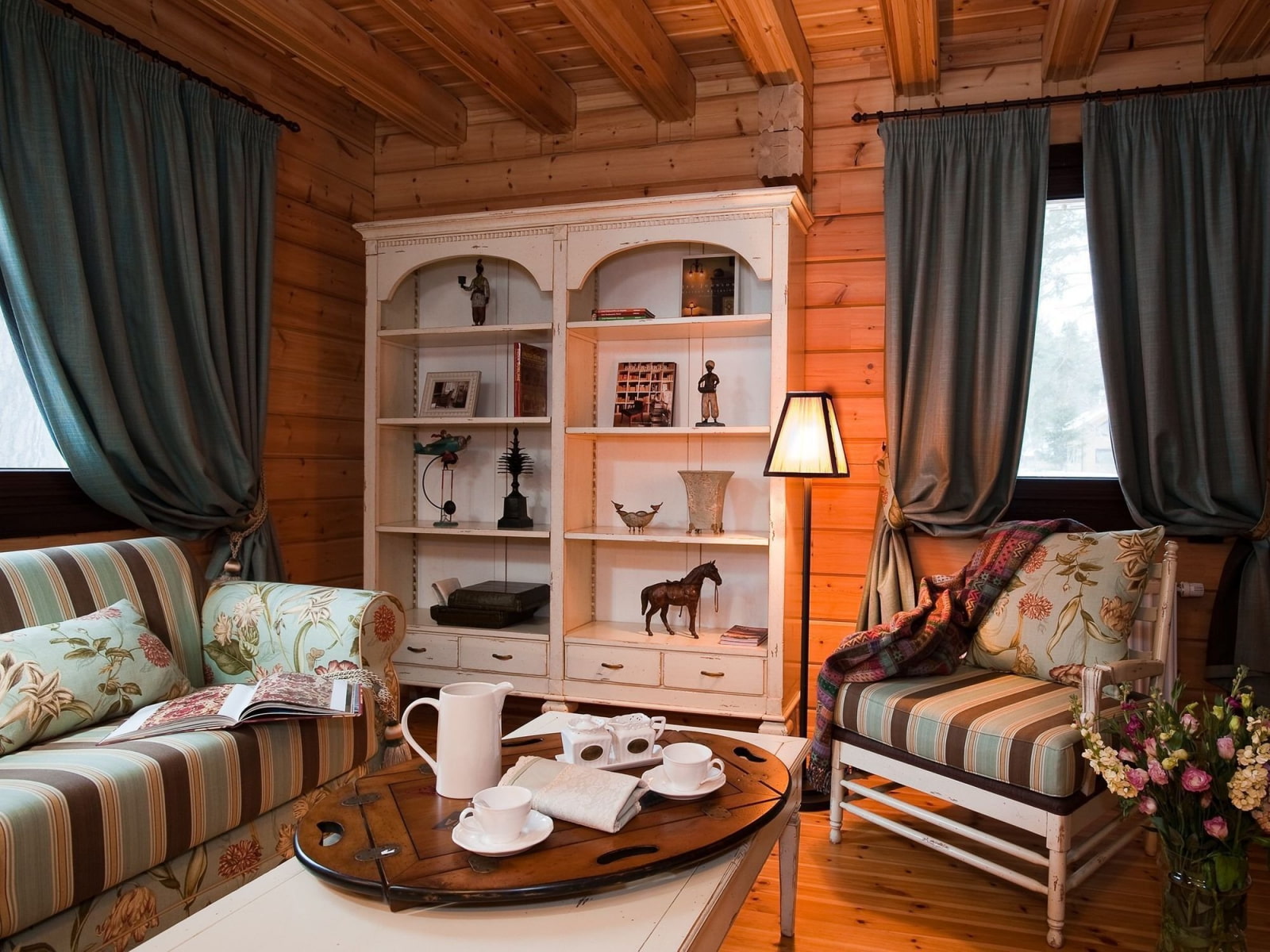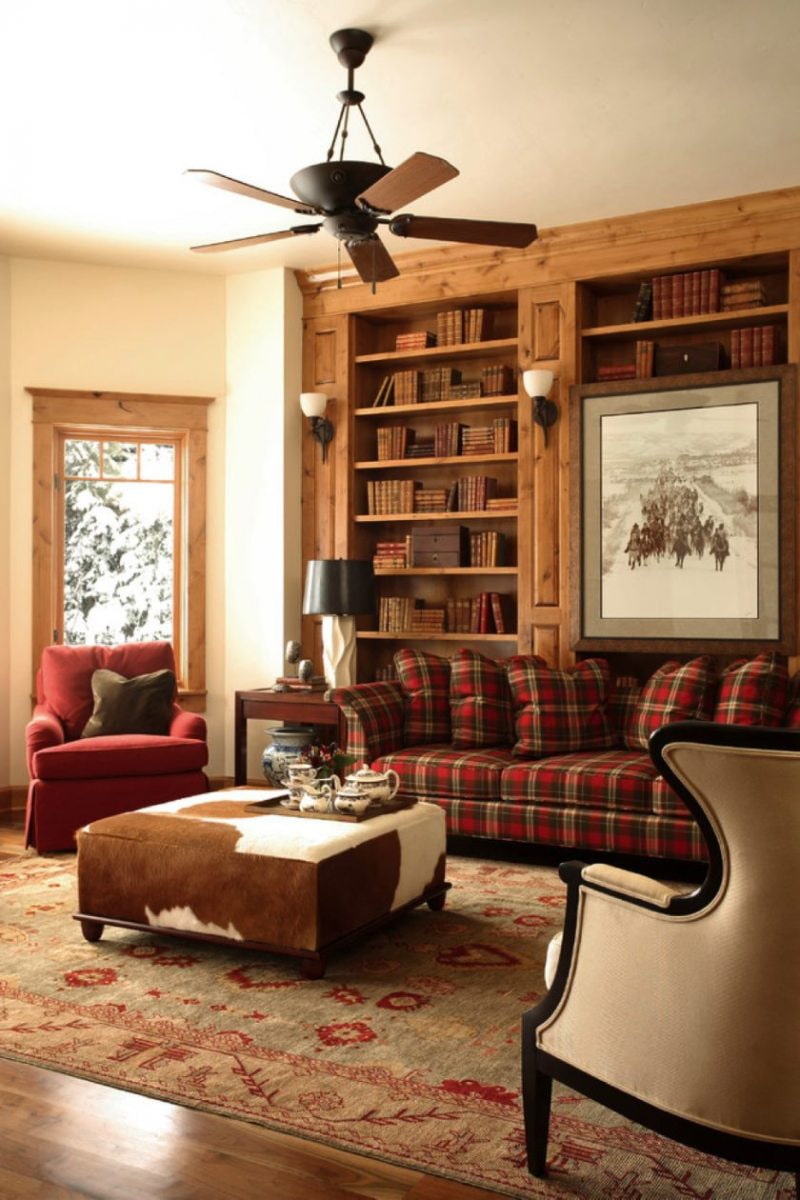 Another integral part of the country interior is carpet... It can be large or small, smooth or fuzzy, but it must be. The composition is completed by armchairs, a coffee table, sideboards, dressers, books in shelves without doors, original lamps, decor.