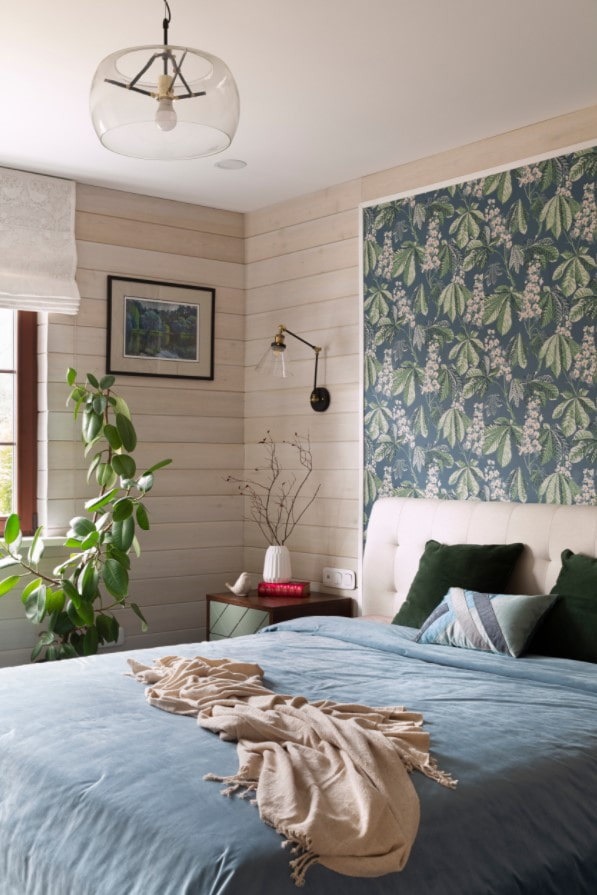 In the photo, a combination of beams on the ceiling with floral wallpaper