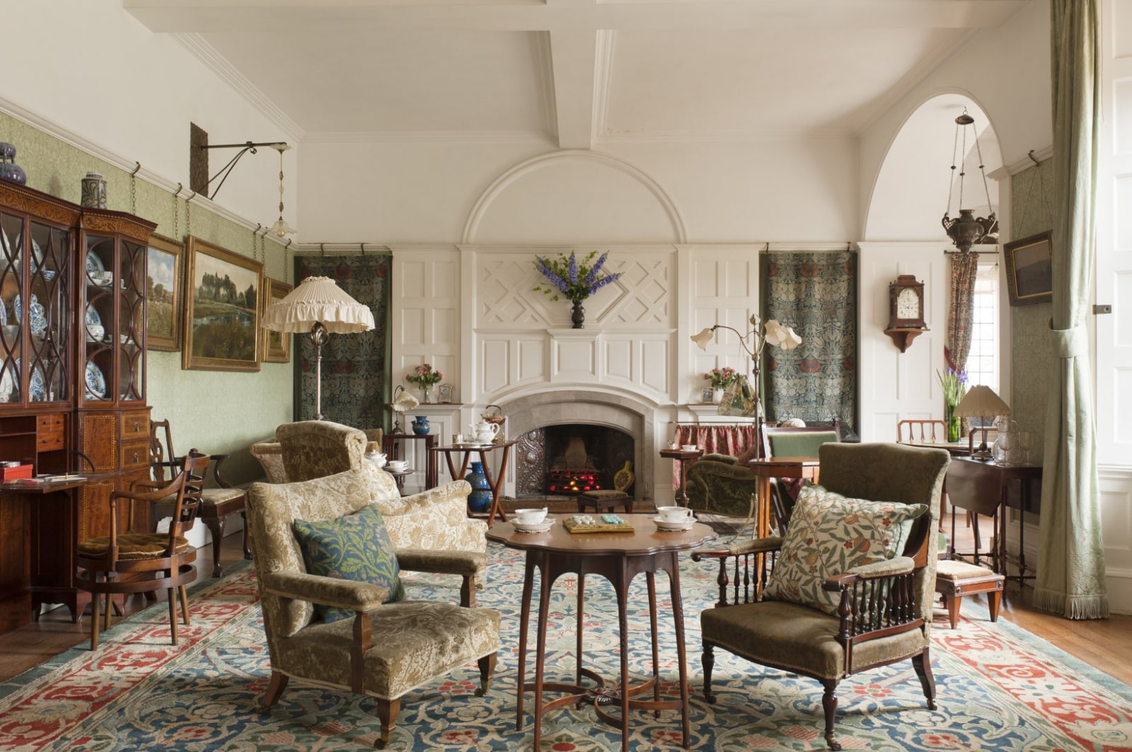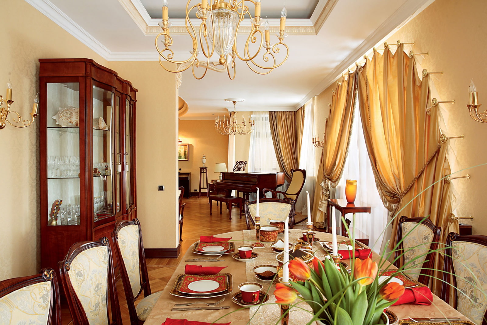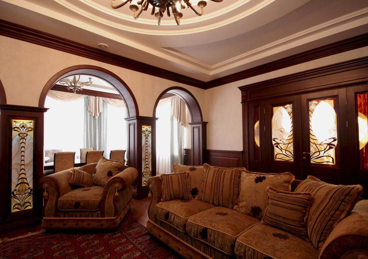 The background (walls, ceiling) is usually made light - both in small and large rooms. Dark doors, mahogany furniture, bright stained-glass windows on the windows or facades look harmoniously on such a "canvas".