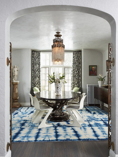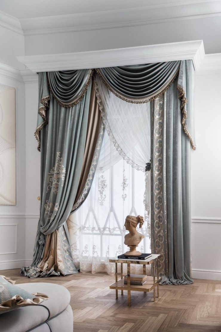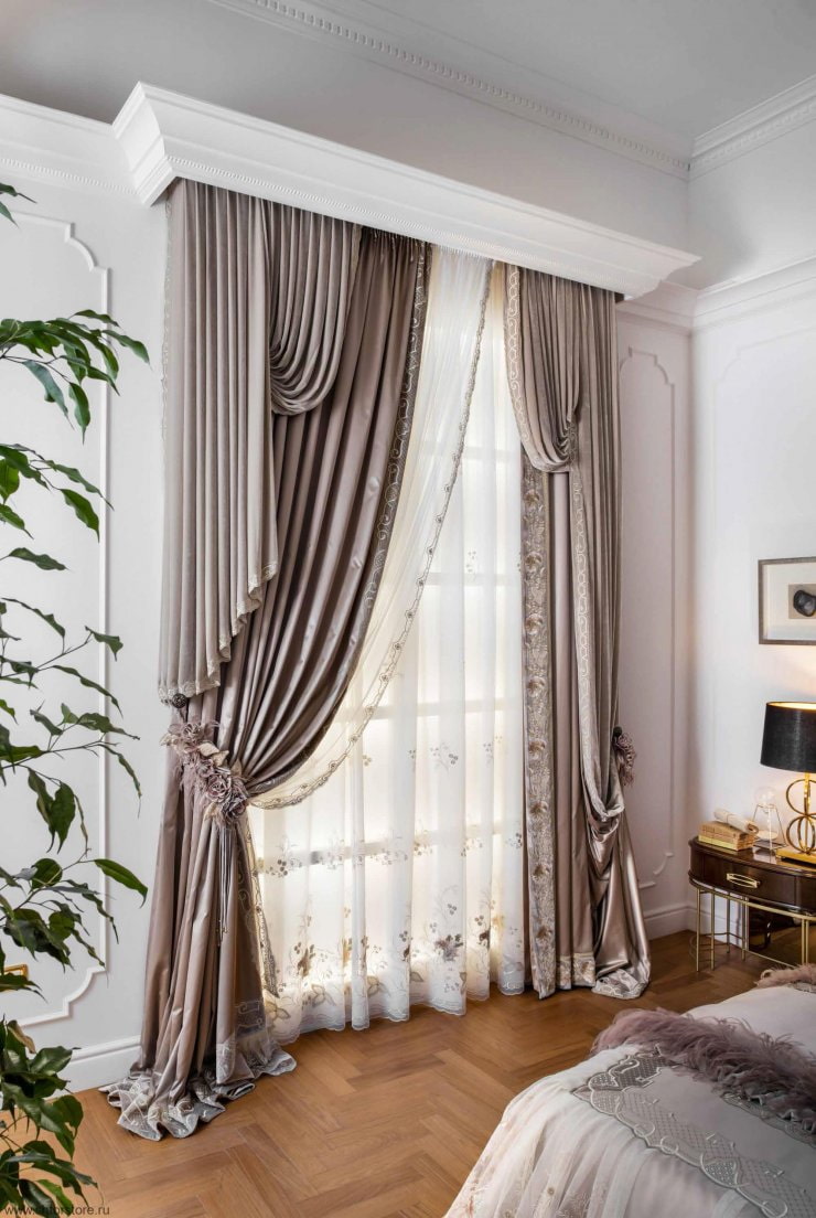 If you are afraid of busting in decorative elements, hang ordinary straight curtains on the floor, attaching them to suspensions on opposite sides of the window. The resulting curves will ideally emphasize your sense of proportion and fit the modern style.