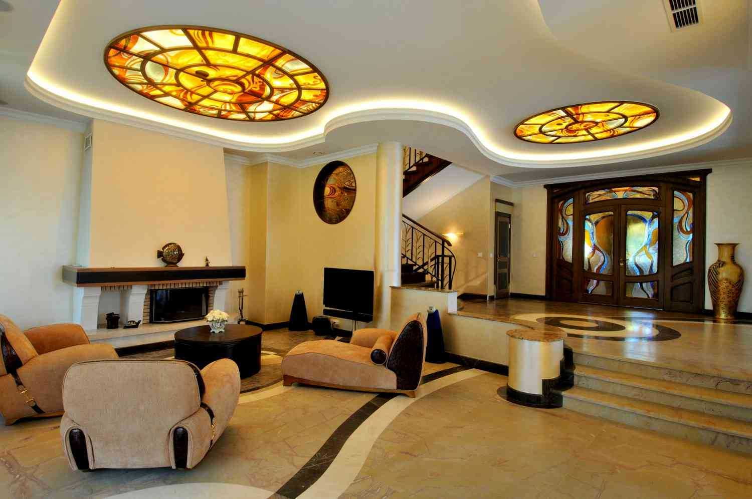 Ceiling both neutral and attention-grabbing. That is, a light (preferably warm white) color is diluted with a rich decor with a floral pattern, stained glass windows, bulky lamps, and stucco. Modern Art Nouveau in the interior gravitates towards multi-level stretch or suspended structures of a smooth shape, you can also use a fabric stretch ceiling with an ornament.