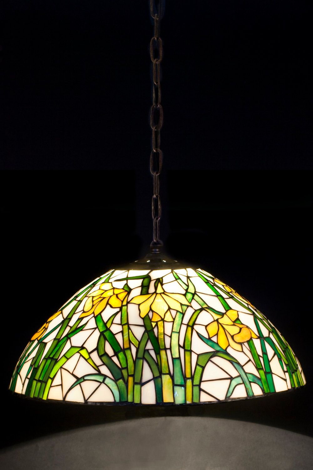 - Ceiling chandelier. Necessarily luxurious, dimensional. The most suitable model is made of forged elements with crystal pendants. Stained glass variations in the American style are also popular. Ceiling-mounted light panels decorated with stained glass are suitable for a modern look.
