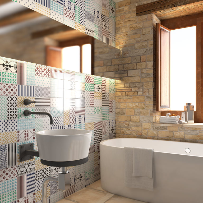 In the kitchen or bathroom, you can use multi-colored tiles to decorate the walls. Here, the imagination is not limited by anything: "patchwork" can be one wall, or part of it, or the whole room, including the floor and ceiling.