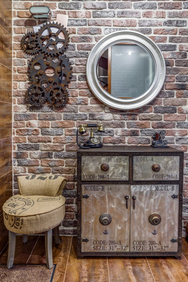 - Walls. Most often they use brickwork or its imitation, sheathing with a barn board or clapboard with subsequent painting, decorative plaster, imitation of concrete. Wall murals with various themes suitable for steampunk design are popular.