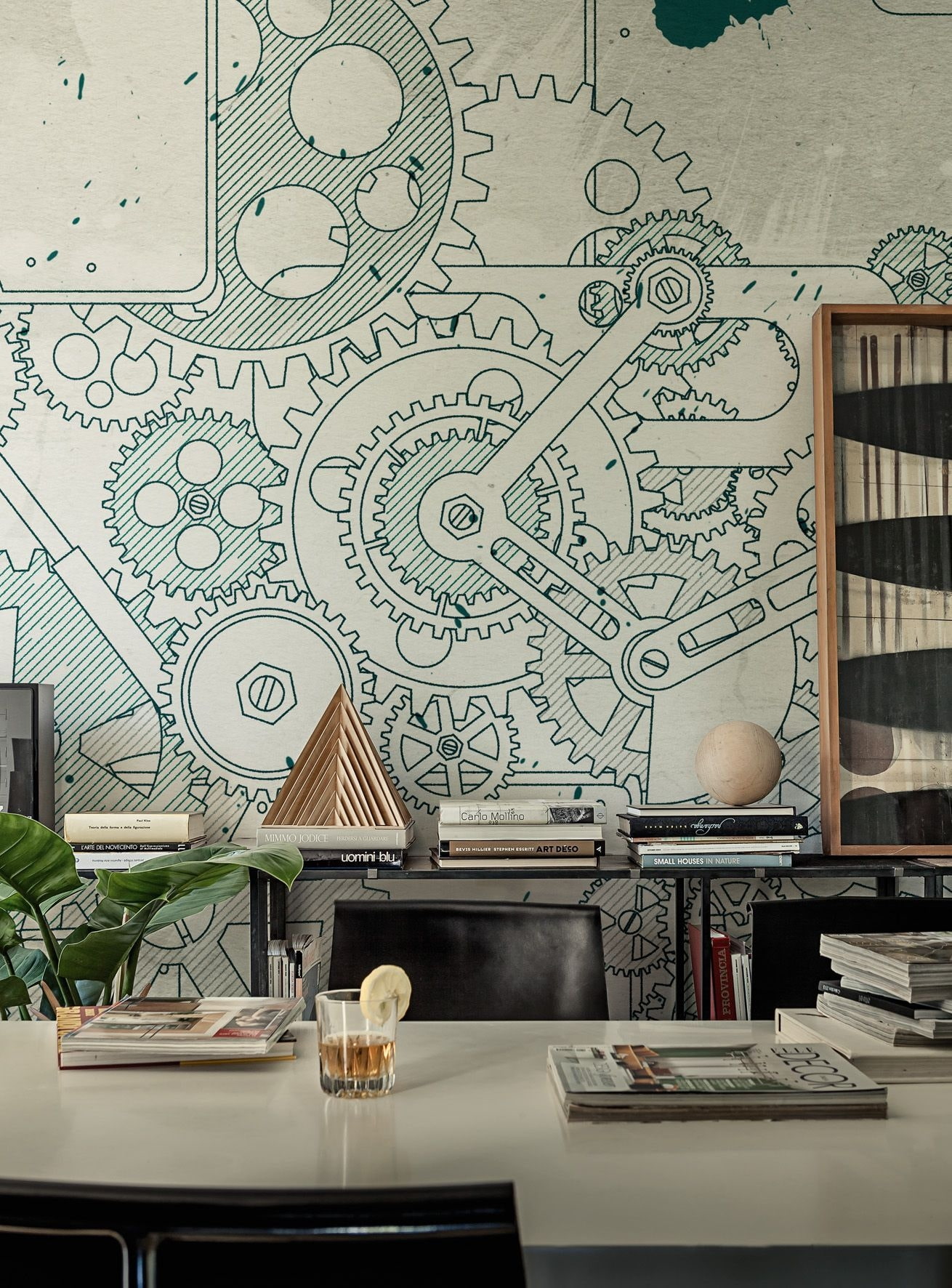 - Details of mechanisms. Gears and other noticeable elements are found in decoration (wallpaper pattern), furniture (engine table) and decor.