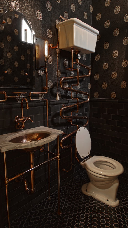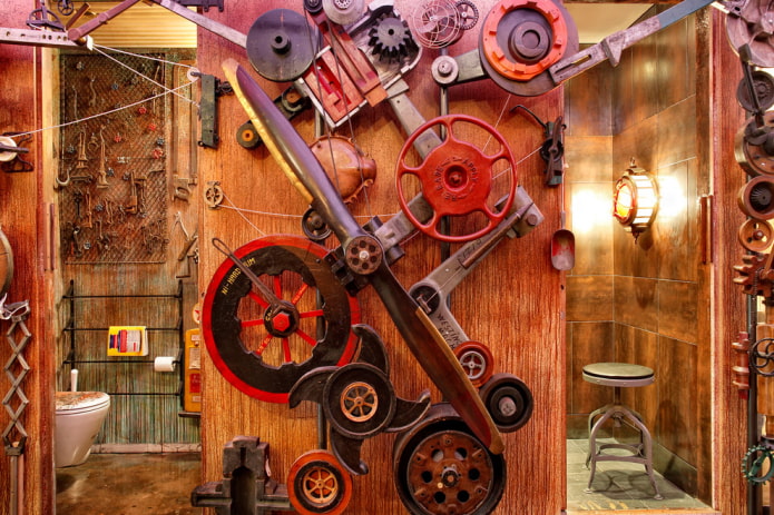 Pay special attention to the steampunk bathroom. Open pipes, unusual brass or copper faucets, iron sinks, mirrors in metal frames are suitable here.