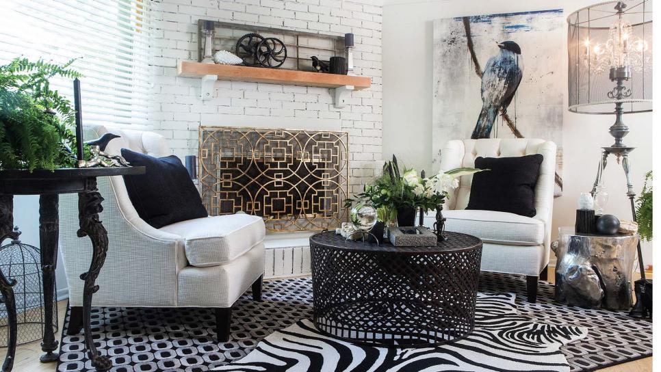 The photo shows a modern interior with industrial decor