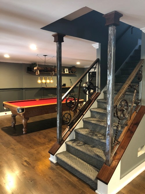The striking steampunk home decor is both cozy and rough.