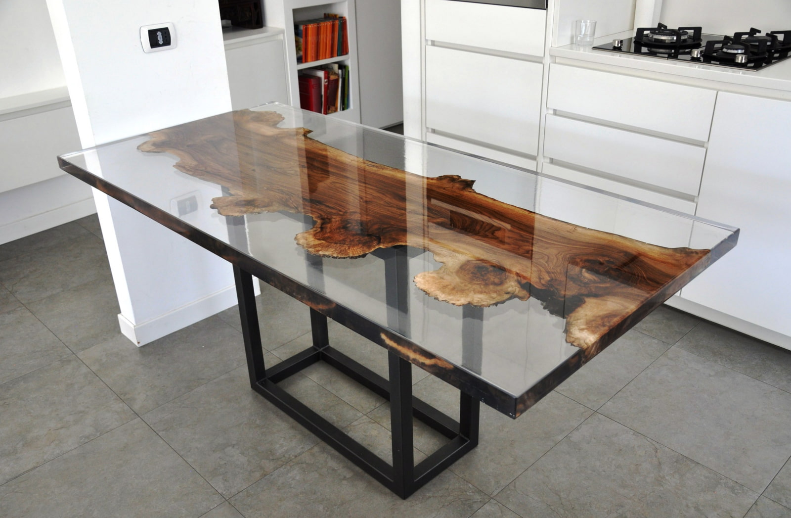 Tables with epoxy resin look light and airy: if there is little space in the kitchen, a transparent surface will help to visually relieve the space.