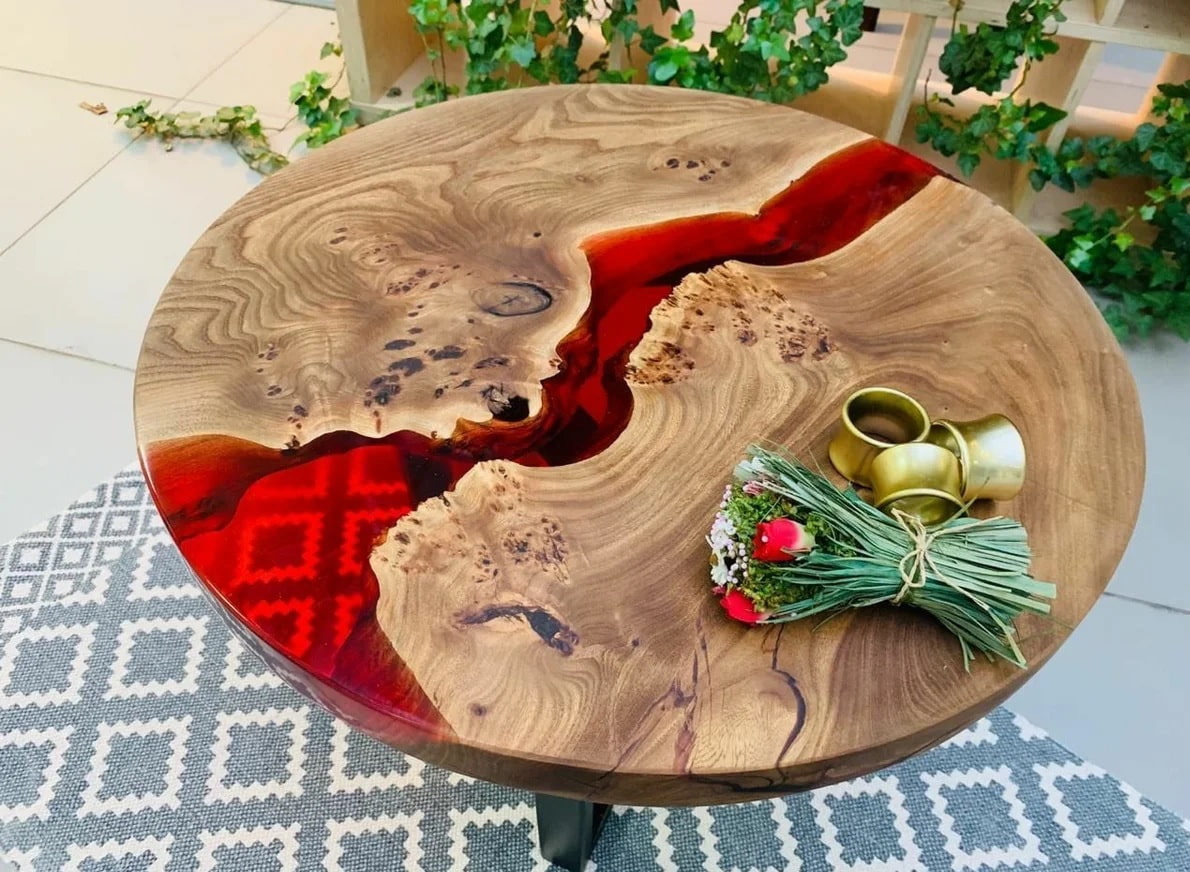 The photo shows a round coffee table made of epoxy resin and wood on a metal support.