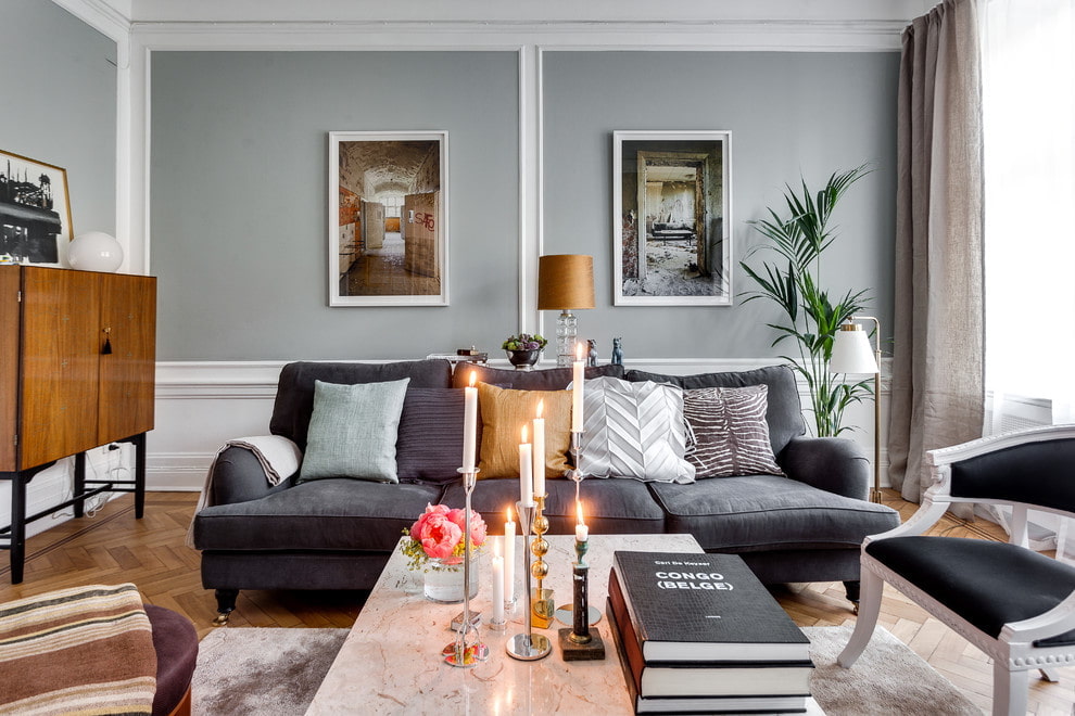 The traditional way to diversify the living room is to place candles on the table in front of the sofa. Today, thin tall candlesticks are in vogue, which instantly catch the eye with their elegance. Therefore, if you want to add grace to the interior, use this technique.