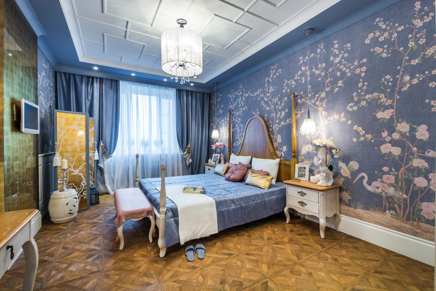Pictured is a bedroom with turquoise textile wallpaper on a synthetic base.
