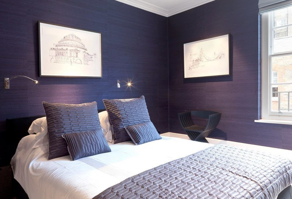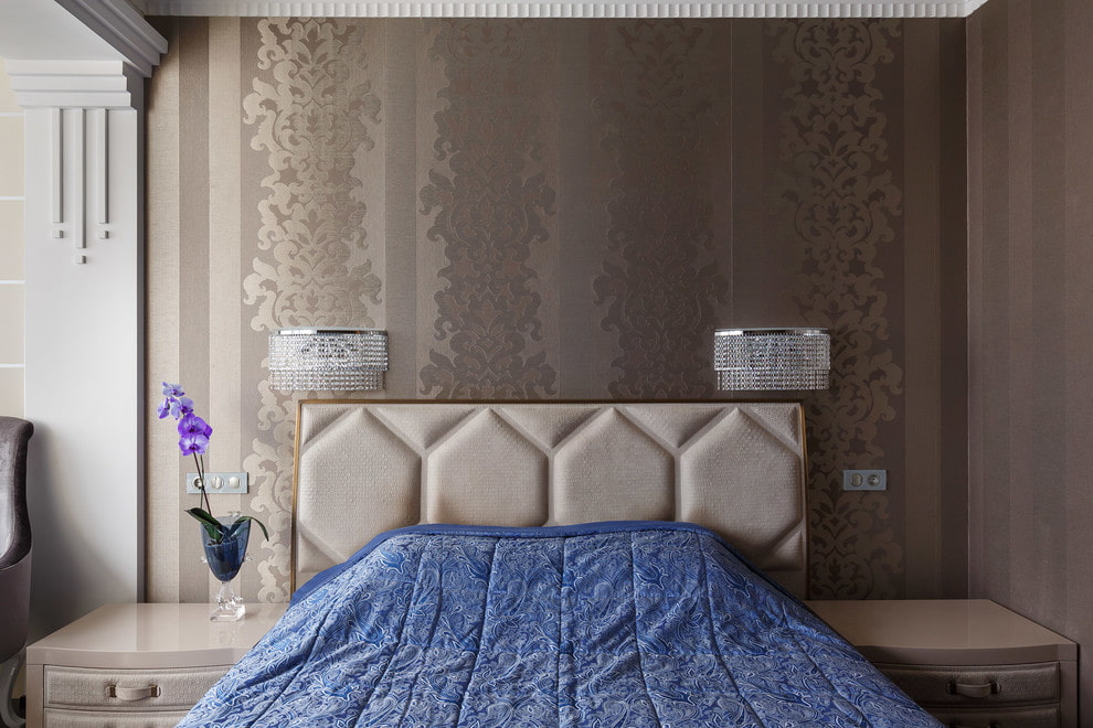 In the photo there is a bedroom and fabric canvases, decorated with molding on the wall.