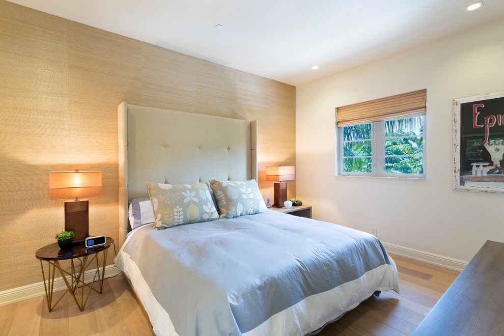 The photo shows a jute textile wall covering in the interior of the bedroom.
