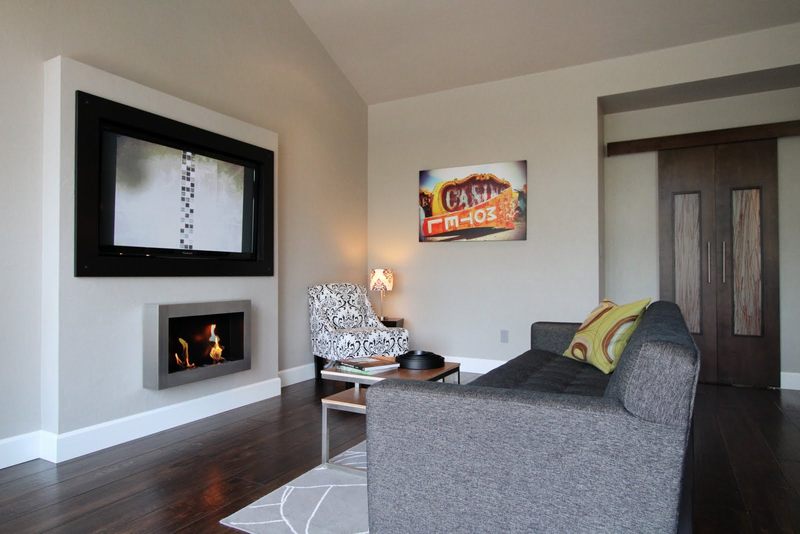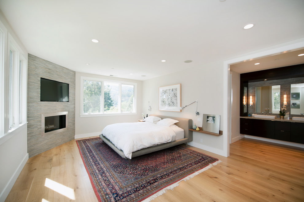 The photo shows a black plasma TV over a biofireplace in the bedroom interior.