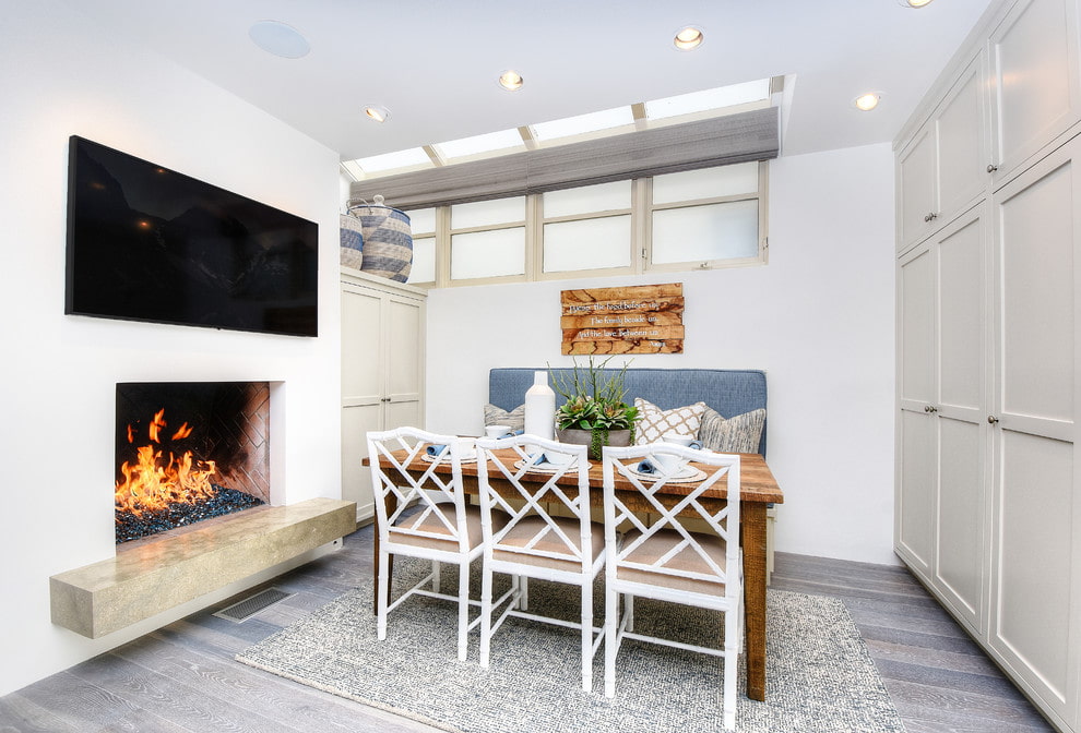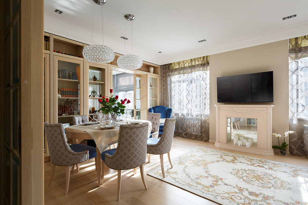 A TV set located above the fireplace, opposite the dining table or on a free wall is a win-win option for the dining room, which provides the opportunity to combine a comfortable pastime with watching your favorite TV programs or movies.