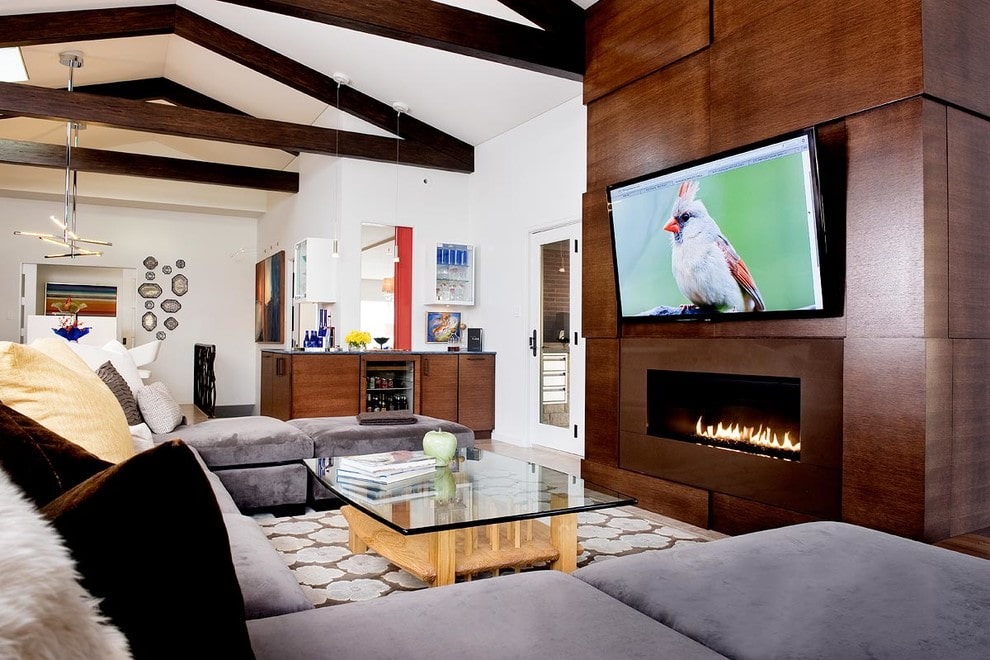 If the TV does not match the interior and is not combined with the fireplace, the TV panel can be hidden in a special niche with sliding doors or using other camouflage systems that can not only hide the plasma, but also become an excellent wall decoration.