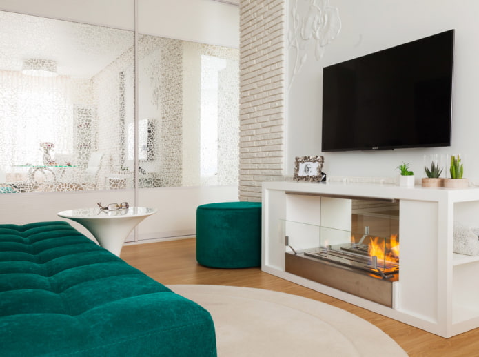 A flat TV and an electric fireplace with a strict and laconic design will perfectly complement a rational and most functional modern interior.